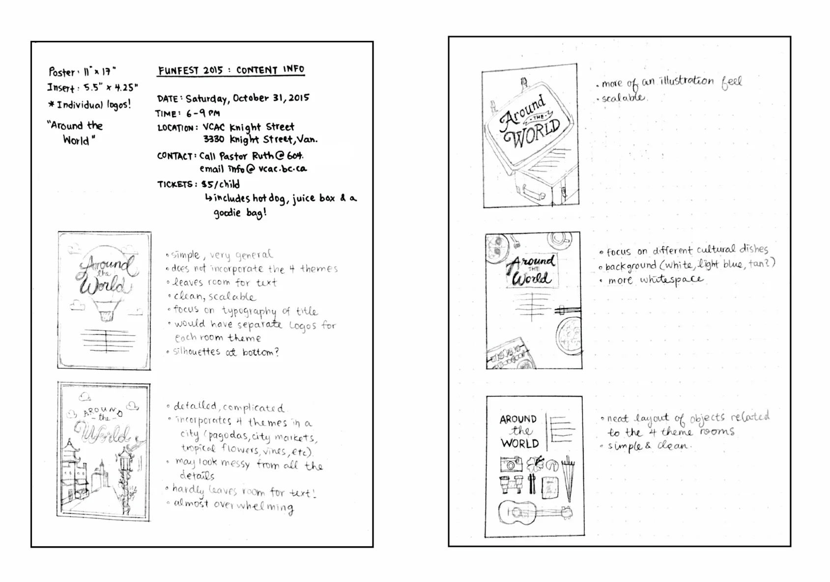 Sketching out several rough iterations, I kept in mind the four thematic ideas to incorporate into one poster design. The sketches were sent for review by the committee who were in favour of the first two sketches. Because they wanted a scalable design that conveys the theme of travel in a simple and direct manner, I was able to incorporate iconic landmarks/landscapes with a general hot air balloon design.
